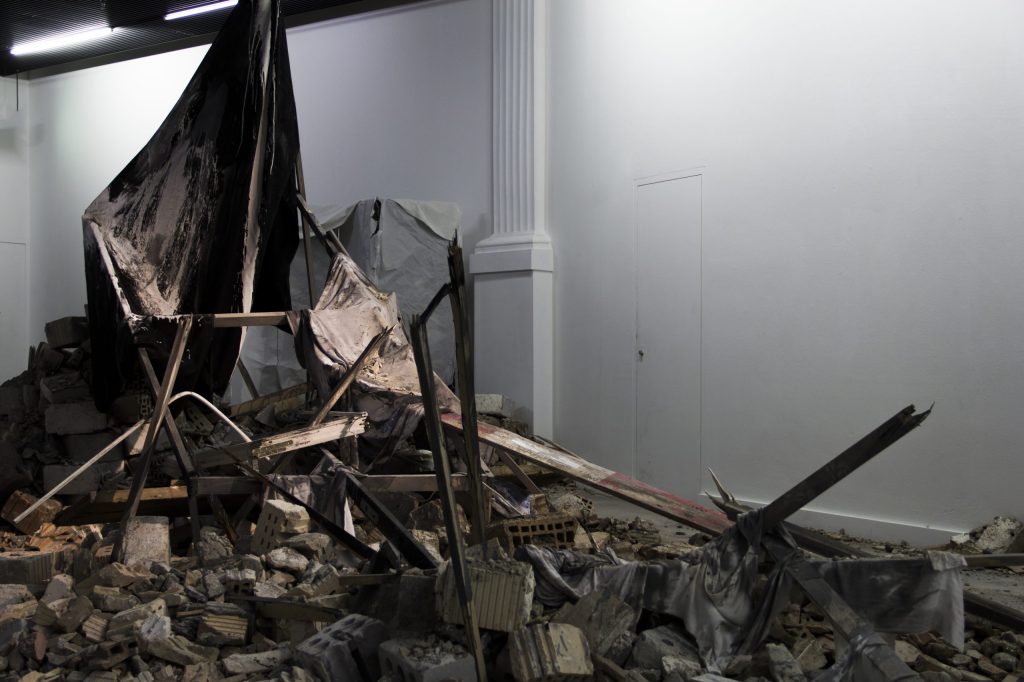 Jeremias: Es gibt bei der Installation eine Meta-Ebene, die es für uns im Kunsthistorischen Museum zum ersten Mal gab. Wir haben unsere Arbeiten bisher nur aus uns selbst entstehen lassen. Wir malen ein Bild – die Farbe gibt es schon – die Ideen werden technisch transferiert, inhaltlich verschränkt und beeinflussen dann so die Komposition des Bildes. Abbildungen von zerfallenem Material mit Geschichte. Jetzt haben wir im Kunsthistorischen Museum, anders als hier, bereits bestehende Ruinen vorgefunden, nämlich als Hintergrundmalerei von Tizian oder Veronese, als Versatzstücke von Ruinenlandschaften von Johann Schönfeld, und uns quer durch die Kunstgeschichte bedient. Wir haben natürlich auch die tatsächlich zerbröckelnden antiken Statuen mit hineingebaut, und sie als Versatzstücke in unserer eigenen Haldenstruktur verwendet. Bei dieser Installation ist es so, dass wir zum ersten Mal mit Material arbeiten, das von Vornherein schon dieser Rest ist, wahrscheinlich von mehreren Ein-Familien-Häusern, die uns hier gerade umgeben.