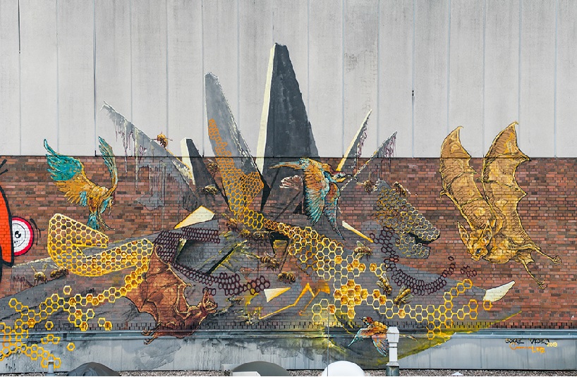 Julia: Ich komme ursprünglich aus der Zeichnung, und die Zeichnung ist auch das, was mich am meisten interessiert. Am interessantesten fand ich immer schon lebendige Wesen, der Mensch, der menschliche Akt, und über Graffiti ist der Fokus mehr auf Tiere gekommen, wobei ich finde, das besser mit dem Urbanen zusammenpasst. Unsere Verbindung ist auch die Liebe zur Natur, zu den floralen Elementen, die da ineinander gewoben sind.