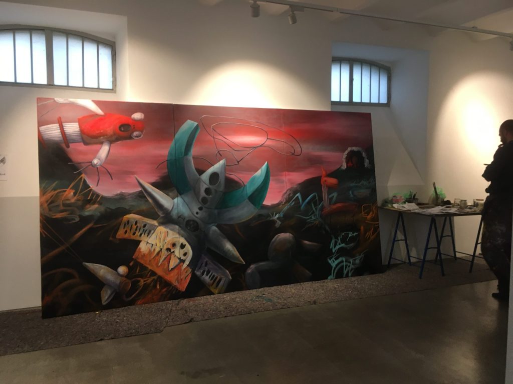 Jeremias: Insgesamt male ich gerade an 14 Leinwänden parallel. Ich lass mir gerade total den Luxus gefallen, dass es gerade möglich ist, von einer Leinwand zur nächsten zu schwirren. Ich male an einer so lange, wie ich es aushalte. Auf allen diesen Leinwänden passiert noch etwas. Und in dem Augenblick, wo ich das Gefühl habe, so jetzt hab’ ich mal genug von der Szene, dann schwirre ich weiter.
