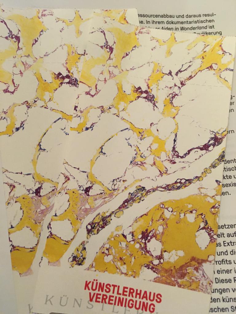 Marie hat mich abgeholt. Dann sind wir am Karlsplatz zum Kunsthaus gefahren wo die Ausstellung war. Dort haben schon zwei Freundinnen gewartet mit den Karten. Dann sind wir ins erste Untergeschoss gefahren und haben unsere Jacken bzw. Taschen in den Spint gegeben. Danach sind wir in den ersten Stock gefahren und dort hat die Führerin angefangen zu erzählen. Es ging dann von Raum zu Raum. Es gab an der Wand Teppiche oder auch Videoinstallationen oder in einem anderen Raum wiederum Musik zu hören war und es ging um Sklaverei, wie es früher war, und die Ausgrenzung und Erniedrigung von Menschen. Im ersten Raum gab es eine Holzplatte am Boden, in der Gläser mit grüner Flüssigkeit steckten, das stand symbolisch für den Rasen bzw. Vorgarten aus Molotowcocktails dargestellt. W24 war auch dort und hat etwas gedreht und Zeitungsartikel gab es auch mitzunehmen. Die Führung dauerte so 45 Minuten. Marie hat mir alles erklärt und gut beschrieben, während wir von Raum zu Raum gegangen sind, parallel dazu habe ich der Führerin zugehört. Die Räume waren gut temperiert und man hat alles gut verstanden. Dann gab es in manchen Räumen Sitzmöglichkeiten, die ich genutzt habe, um mich auszuruhen. Die Videos mit Kopfhörern zum Hören waren aber leider auf Englisch, wäre besser auf Deutsch gewesen. Es ging auch relativ zügig voran, was mir sehr gut gefallen hat.