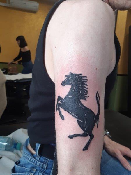 Hannes K. geht regelmäßig reiten und fährt liebend gerne Sportwagen. Seine Entscheidung, sich das Ferrari Logo (schwarzes Pferd) tättowieren zu lassen, wird er sicher nicht bereuen. Wir finden, es passt zu ihm und es ist sicher ein Klassiker unter den Tattoos. Es besticht durch die wilde Bewegung des Pferdes und seine gleichzeitig schlichte Eleganz.