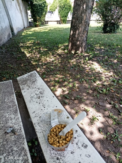 Heute ist der erste Tag im Juli. Es ist heiß. Ich esse Kichererbsen am Wiener Neustädter Friedhof. Hab den Bus verpasst. Bin zu spät zum Plasma spenden. Ich brauche Proteine. Zwei Mal pro Monat geh ich Plasmaspenden, fürs Geld. Aber auch für den guten Zweck. Aber hauptsächlich fürs Geld.