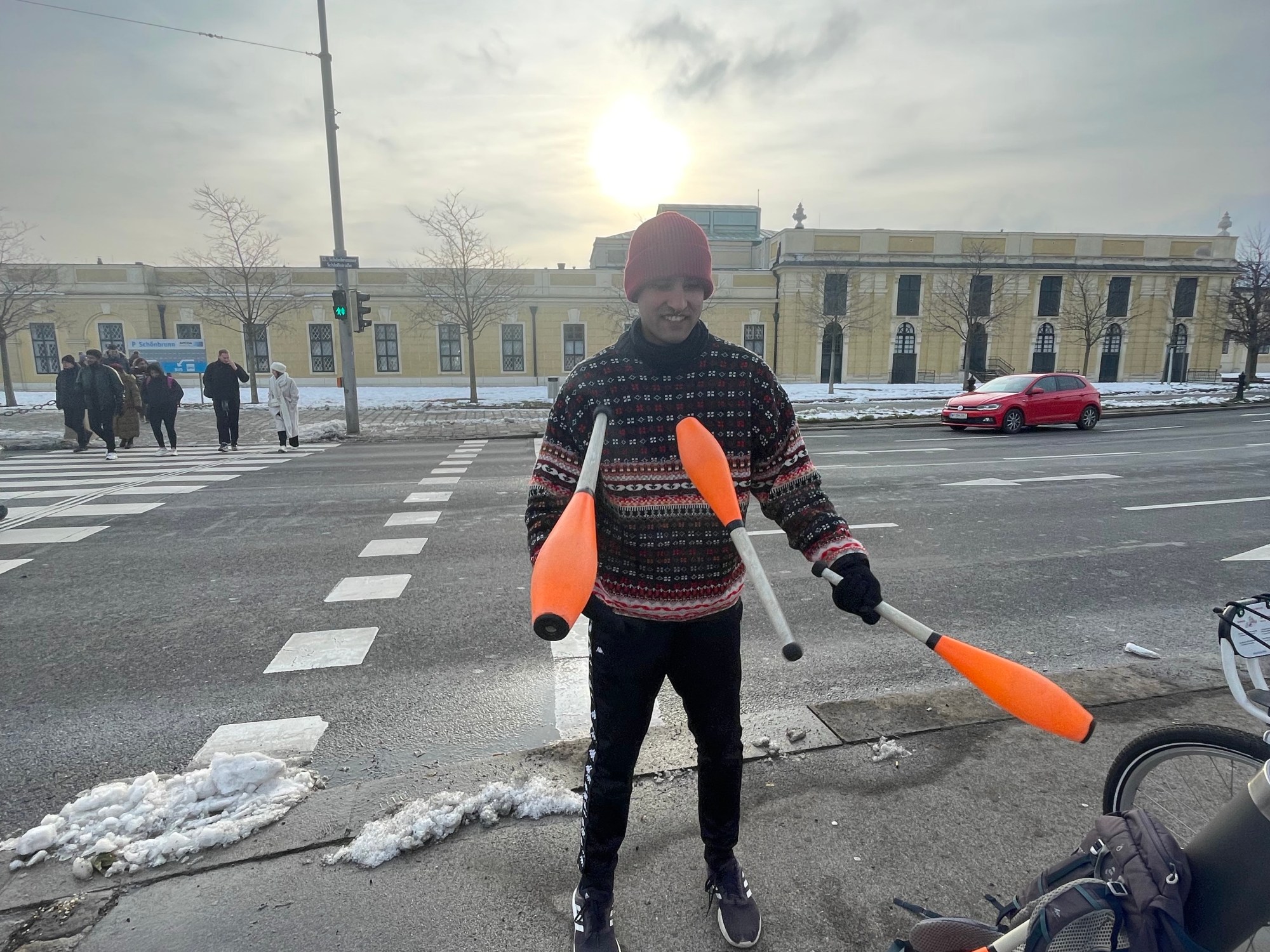 „Hey can I have a buff?“, fragt mich Lautaro bei der 10A Station Familienplatz. Wir kommen ins Gespräch und es stellt sich raus, dass Lautaro ein Straßenkünstler aus Argentinien ist. Er besitzt aber auch die italienische Staatsbürgerschaft, weil sein Großvater Italiener war, erzählt er mir, während wir auf den Bus warten und uns vor der Polizeistation einbuffen. Ich frage Lautaro, was in der Sprache der Mapuche der schnelle Raubvogel heißt, ob er bei mir auf der Couch übernachten möchte und wir dafür ein Interview für KUSO mit ihm machen dürfen. Er stimmt zu und so folge ich ihm zuallererst direkt nach Schönbrunn, wo ich ihn in Action, also bei der Arbeit fotografieren und filmen darf, wohlgemerkt bei klirrender Kälte. Am nächsten Tag kommt er auch schon mit Sach und Pack bei mir in meiner Einzimmerwohnung an. Er ist ein unauffälliger aber geselliger Gast, der nicht scheut mein ganzes Geschirr zu waschen und mir sogar ein Gastgeschenk, nämlich einen Weihnachtspyjama macht. Zusammen haben wir Hanf Brownies gebacken und ich hab ihm das Neunerhaus Café in der Margaretenstraße 166 gezeigt, wo man gegen eine freie Spende ein warmes Mittagessen bekommt. Lautaro hat in mir die Sehnsucht nach der Ferne geweckt, hat mir Mut gemacht, dass es auch anders geht, das Leben zu leben, anders als ich es kenne und Hoffnung auf eine bessere Welt.