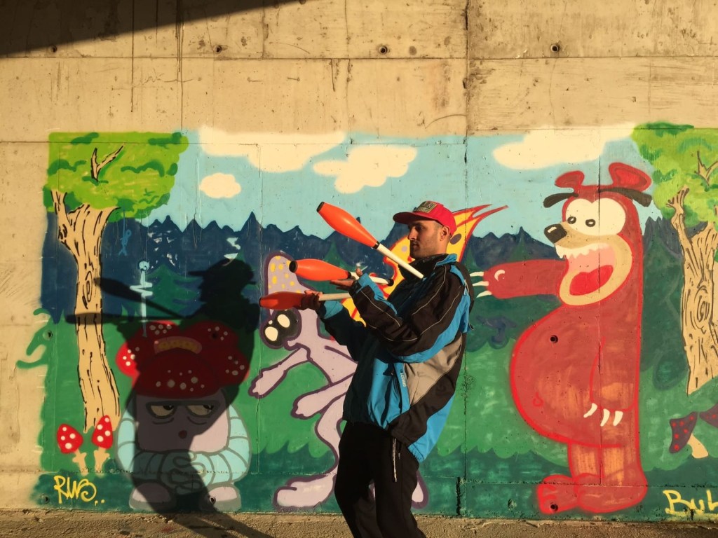 E: Around 2017 I started juggling, in the middle of a trip through South America. At that time I was traveling with a friend in Colombia. He taught me the first thing about juggling over the years, because we are childhood friends. I mainly remember my first practices in Buzios, Brazil, where I lived for almost two years.