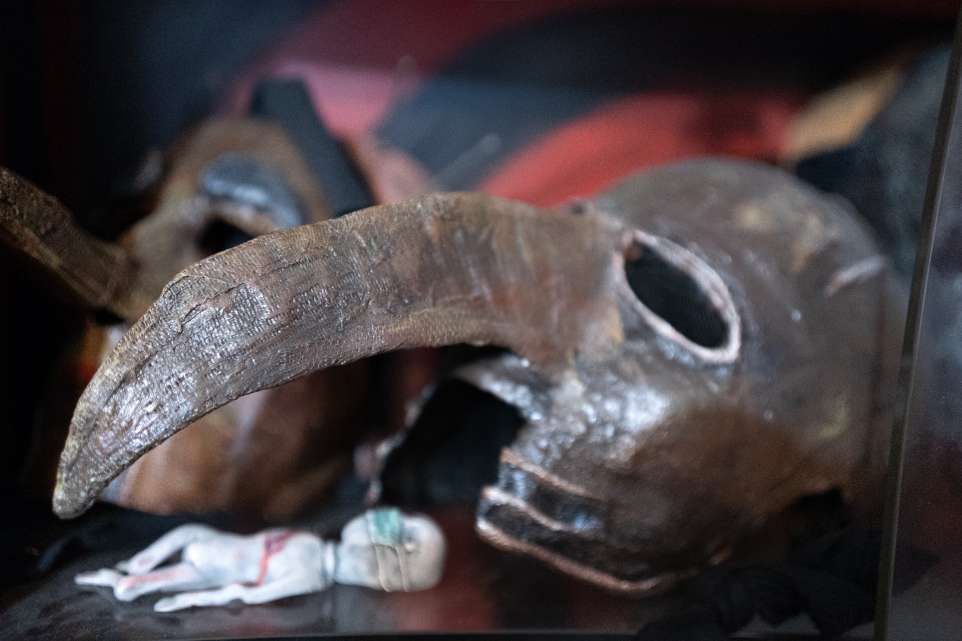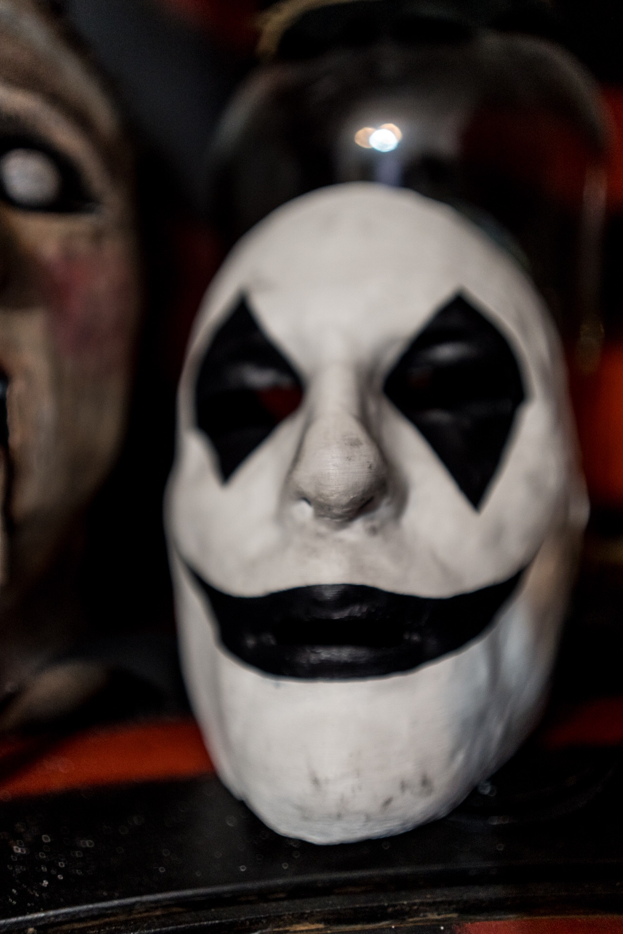 Die hab ich alle selber aus Gips gemacht und bemalt. Aber die weiße Maske, die hab ich aus einem 3D-Drucker machen lassen. Ich hab aus Gips-Bandagen mein Gesicht abmodelliert, hab‘s denen gegeben und die haben das dann eingescannt und drucken lassen im Shop.