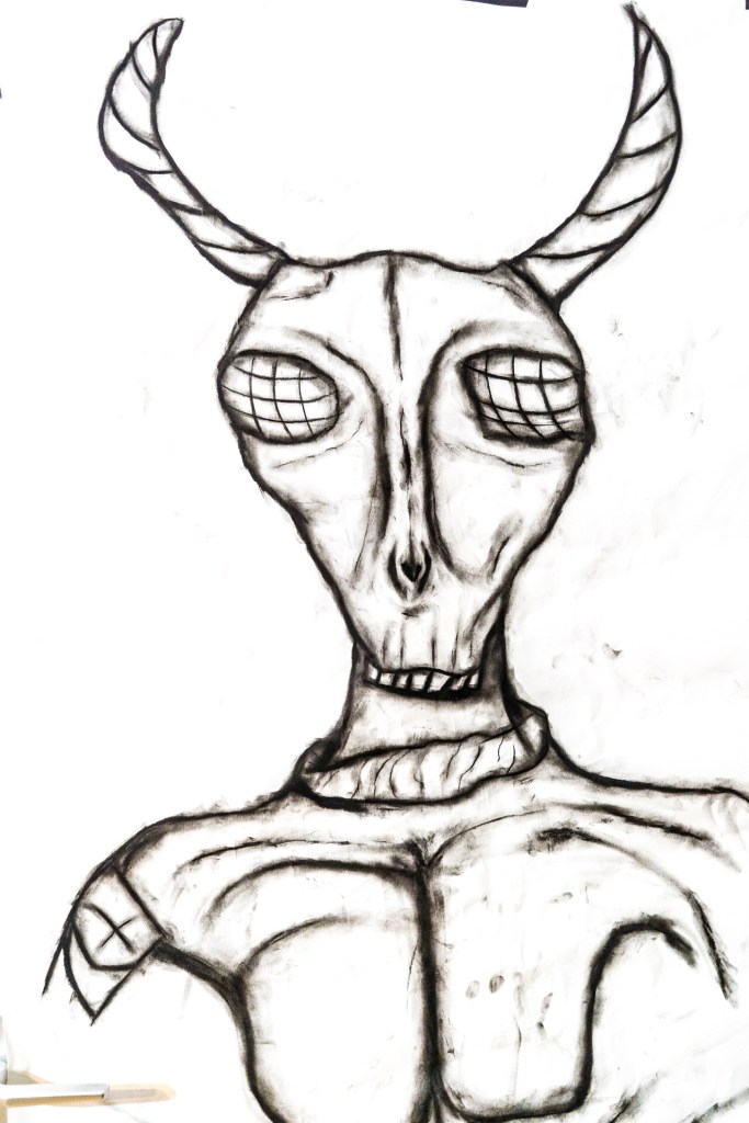 Aber total unterschiedlich deine Sachen. Mal Schwarz auf Weiß dann irgendwelche Figuren und dann bunt. Dann die ur, ich sag mal, düsteren Sachen. Masken auch. Wie lang arbeitest du an so ner Maske?