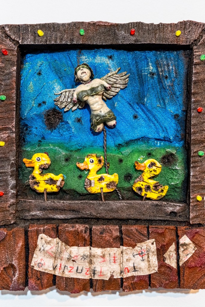 Ich meine es ist eh vielleicht banal als Künstler, aber vieles spiegelt einfach die Leute oder die Welt wieder, wie ich sie wahrnehme oder sehe, Manches ist dann vielleicht ein bisschen morbide oder übertrieben oder überspitzt. Vieles, glaube ich, hat heute vielleicht so ein bisschen einen Witz oder ne Cuteness. Zum Beispiel das mit den Entchen.