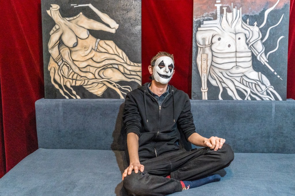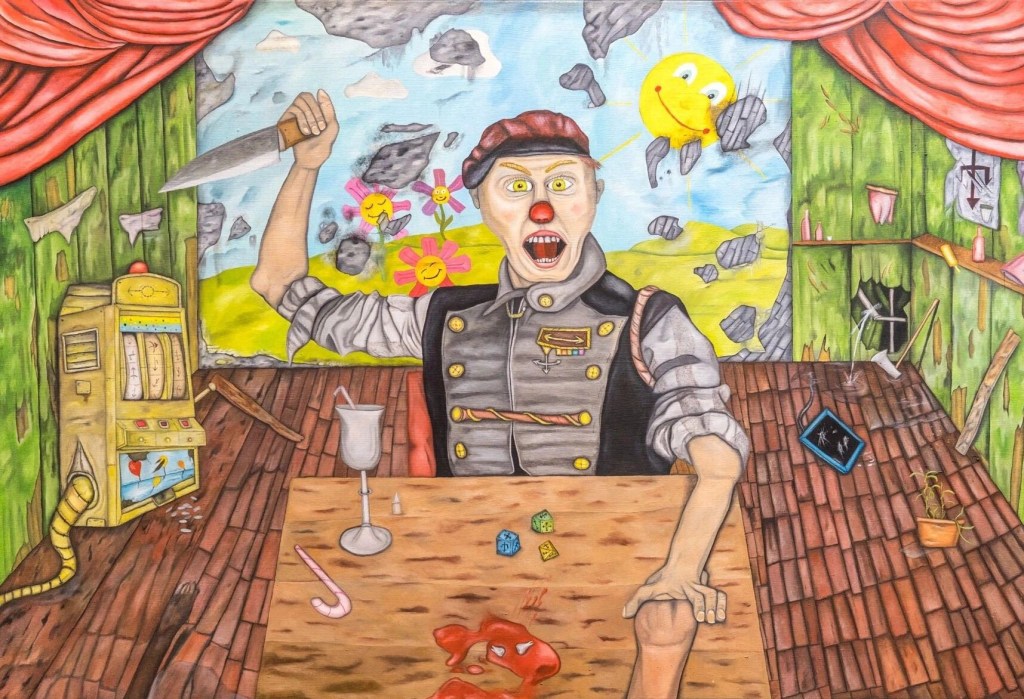 Voll. Also ein Grund, warum ich noch dort bin (am Theater, Anmerkung von der Redaktion), wenn es jetzt nicht, sag ich mal direkt förderlich für meine Malerei ist. Aber alleine schon dieses Flair oder das Reden mit den Leuten weißt du und einfach dieses Umfeld, es sind alle total lieb, total offen, jeder hat irgendwie was mit Kreativität, zumindest im weitestgehenden Sinne zu tun oder zumindest Interesse an Kunst. Es macht Spaß, wirklich. Und ich glaube auch, dass mich das viel beeinflusst hat. Da hinten der Clown zum Beispiel ist definitiv ein Theater.