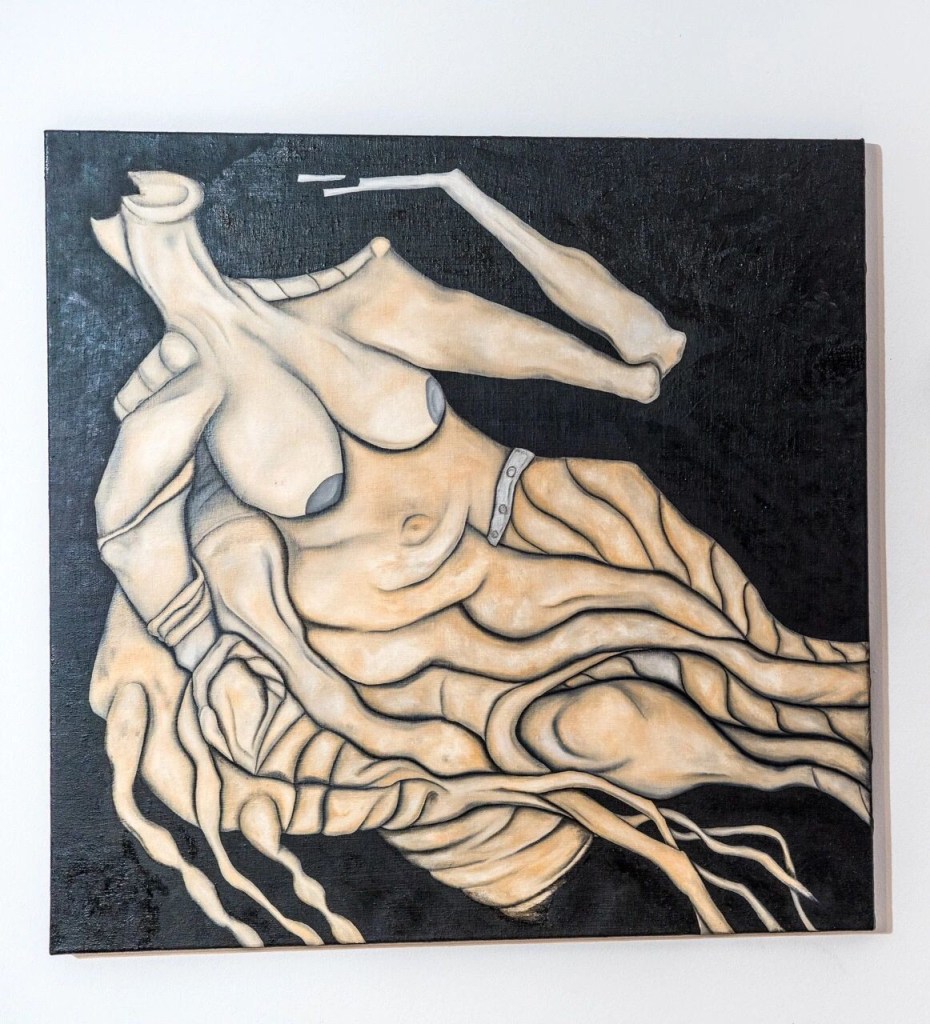 Dieser Mix aus klassischer Malerei, ein bisschen Akt, eben doch abstrahiert. Modernisiert. Die drei Arbeiten sind mehr oder weniger aus dem entstanden, dass ich die Performances gemacht hab. Dann hab ich mir gedacht, jetzt mach ich mal ein bisschen was Männlicheres und hab mir gedacht, grad aktuell mit Krieg und das sind ja meistens auch die Männer, vielleicht statt einem Arm auch mal ein angedeutetes Gewehr. Ein Kumpel meinte das hier wirkt auch wie eine Krone. Und als drittes hab ich mir dann gedacht, mach ich irgendwas in die Richtung jetzt nicht Frau, nicht Mann, das ist dann schon ein bisschen wie ein Tier fast.