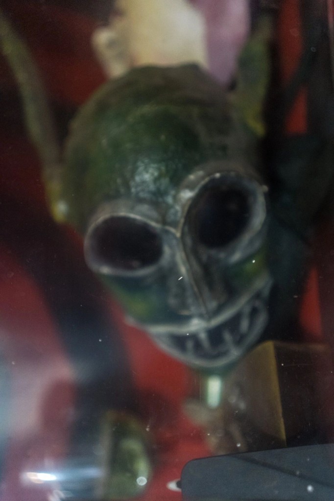Das ist Schaumstoff, das, was da in der Couch drin ist, der Stoff und dann mit Acrylfarbe und Binder so lange bearbeitet und eingelassen, bis es hart ist. Total Mixed-Media. Die Leute sind immer überrascht, was man aus Fimo alles machen kann. Die Masken hab ich gemacht in der Uni Zeit auf der Angewandten für Fotos und Filme und die stehen da halt jetzt rum.