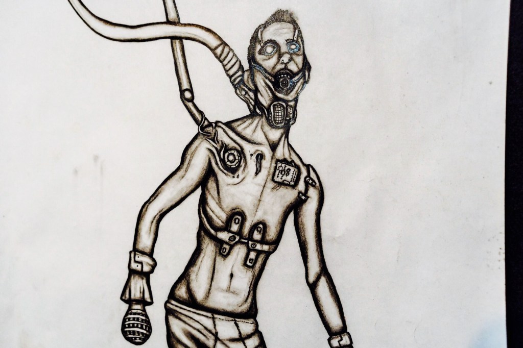 Also wenn ich privat zu Hause bin, Metal zum Malen, viel Korn in letzter Zeit oder zum Beispiel mag ich viel Techno, so wie bei den Performances, aber mehr so Hard Techno oder Dark Techno aber ich habe es gerne hart. Und beim Malen dann hin und wieder vielleicht Django Ryan, das ist so 30er Jahre Swing. Manchmal Soundtracks von Filmen beziehungsweise Computerspielen.