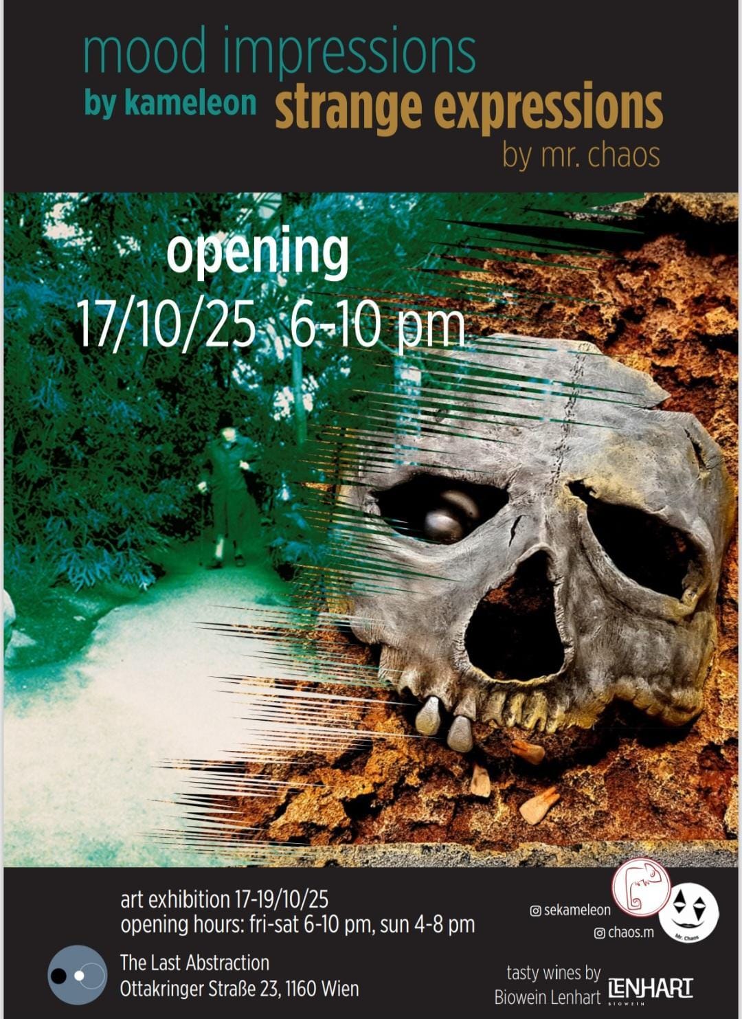 Kameleon und Mr. Chaos haben sich in der Kunstszene in Wien kennen gelernt und gleichzeitig die Galeristen der Lokalität, in der sie gemeinsam ausstellen werden. Aus Sympathie zueinander und weil die Künstler*innen die Arbeiten des anderen sehr schätzen, haben die beiden beschlossen, ihre Neuesten aber auch älteren Werke in der Galerie The Last Abstraction zu zeigen, die auf der Ottakringerstraße liegt.